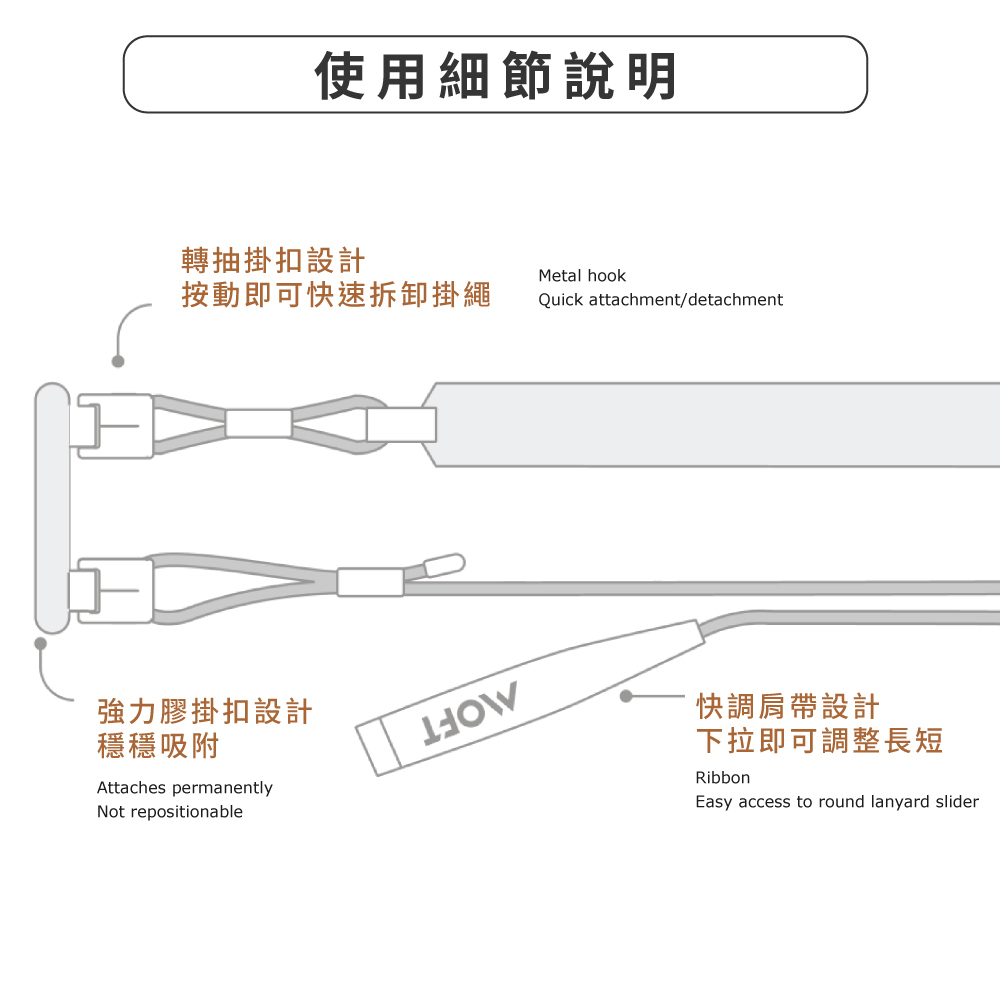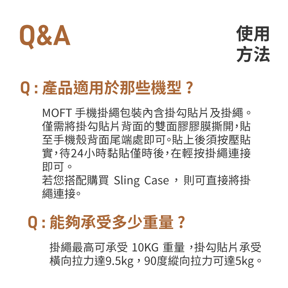 1.MOFT手機掛繩如使用內附「一字扣」和「磁吸/黏貼款手機支架」一起搭配使用時,不適用以下型號:iPhone SE / iPhone12 mini / iPhone 13 mini / iPhone 14 Pro。
