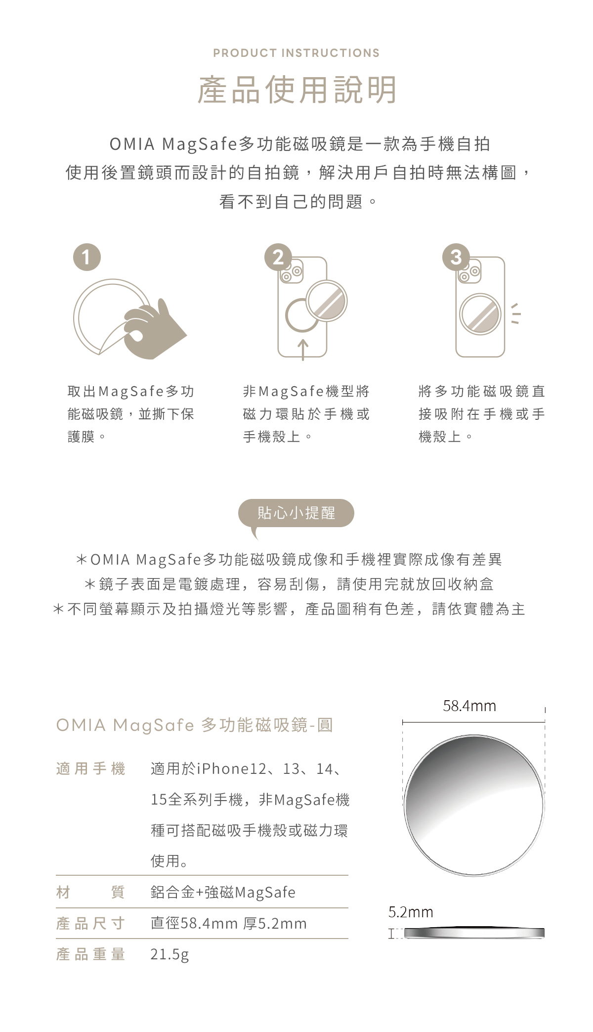 (1)OMIA MagSafe多功能磁吸鏡成像和手機裡實際成像有差異。